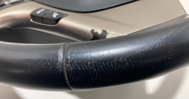 In fair cosmetic condition due to the leather having heavier wear as shown in the photos. The trims have some chipping and marks from use, as shown.